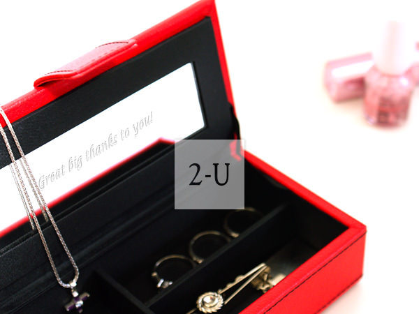 紅色的底色配上黑色的針腳,尤為醒目。 既可以作為旅行用的首飾盒,也可以存放宴會用的整套飾品,或是存放縫紉用的整套針線等。飾品盒小巧實用。 鏡子中央可以刻一行字。