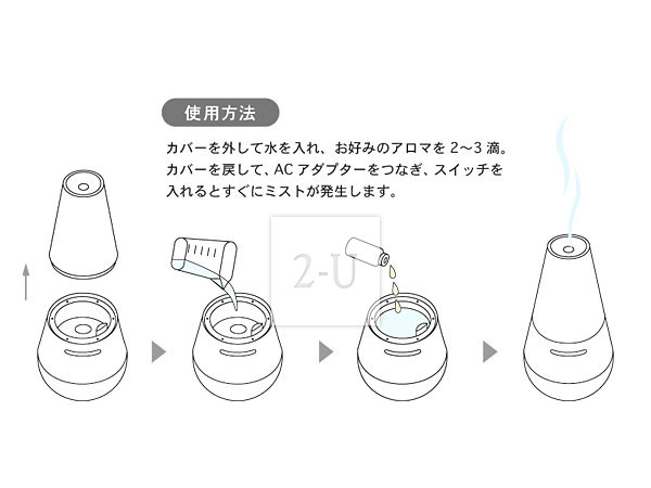 文字顏色 : 白色 商品包含 : 超音波精油噴霧器,AC電源適配器 * 未附送精油。 電源 : AC (交流電源) 24V 12W * 請註意您所在地區的額定電壓,如果不同請使用穩壓器。 規格 : 約W107 x H212 x D107 mm 材質 : 聚丙烯 重量 : 約290g (噴霧器本身) 包裝盒 : 紙盒 (約287 x 120 x 120 mm) MADE IN CHINA