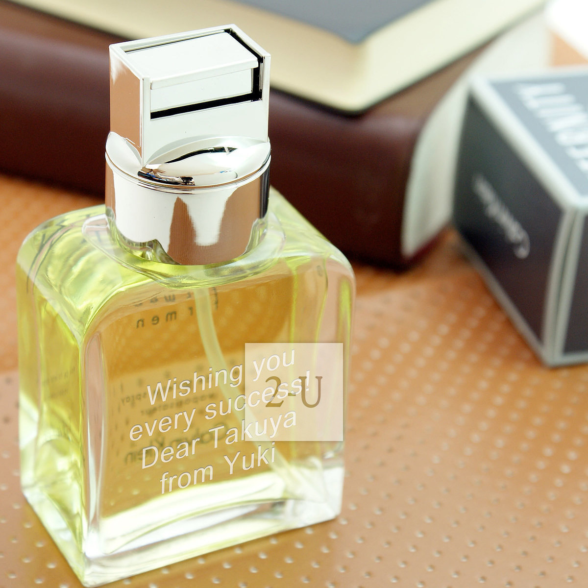 刻有信息的香水昨天送給他暸。 我看到禮物製作精美很開心,但是不知道他收到禮物是什麼感覺。他收到禮物以後,很是喫驚,說 "能有這樣的禮物呀!" 我想這禮物一定能留在他心浬的。這次謝謝 2-U。 我訂單下得很遲,但是 2-U 處理得很及時。今後還有機會我還會訂購的。