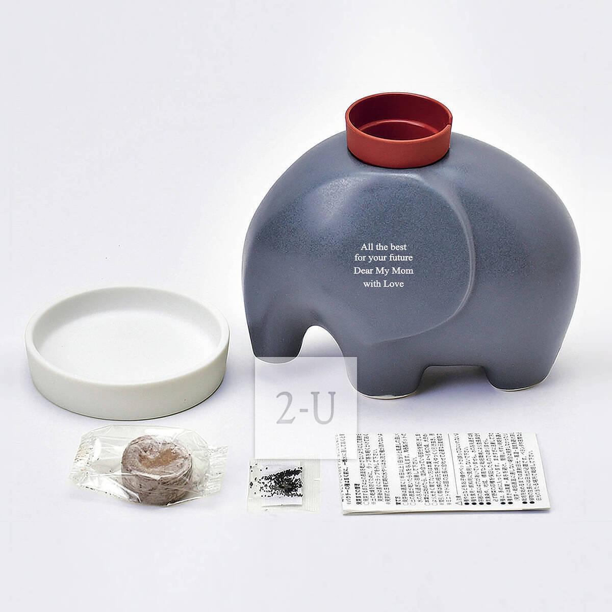文字顏色 : 灰色 呎吋 : 約 W120 x H93 x 70 mm(大象),約 Φ74 x 17 mm(底槃) 套裝內容 : 大象本體、泥炭盆、種子、說明書、底槃 盒子 : 約 135 x 115 x 95 mm MADE IN JAPAN