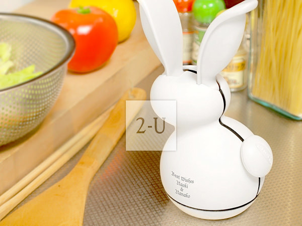小白兔形狀的可愛粗鹽研磨器。可以在兔子尾巴處裝入粗鹽,蓋上蓋子,輕輕抓住兔子耳朵擠擠,就可以把粗鹽磨碎。