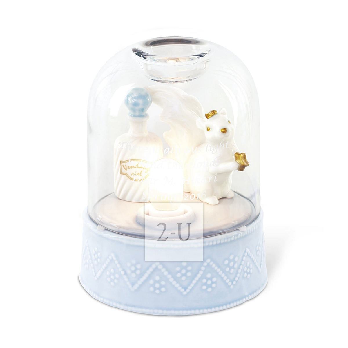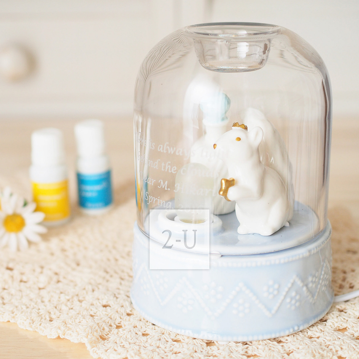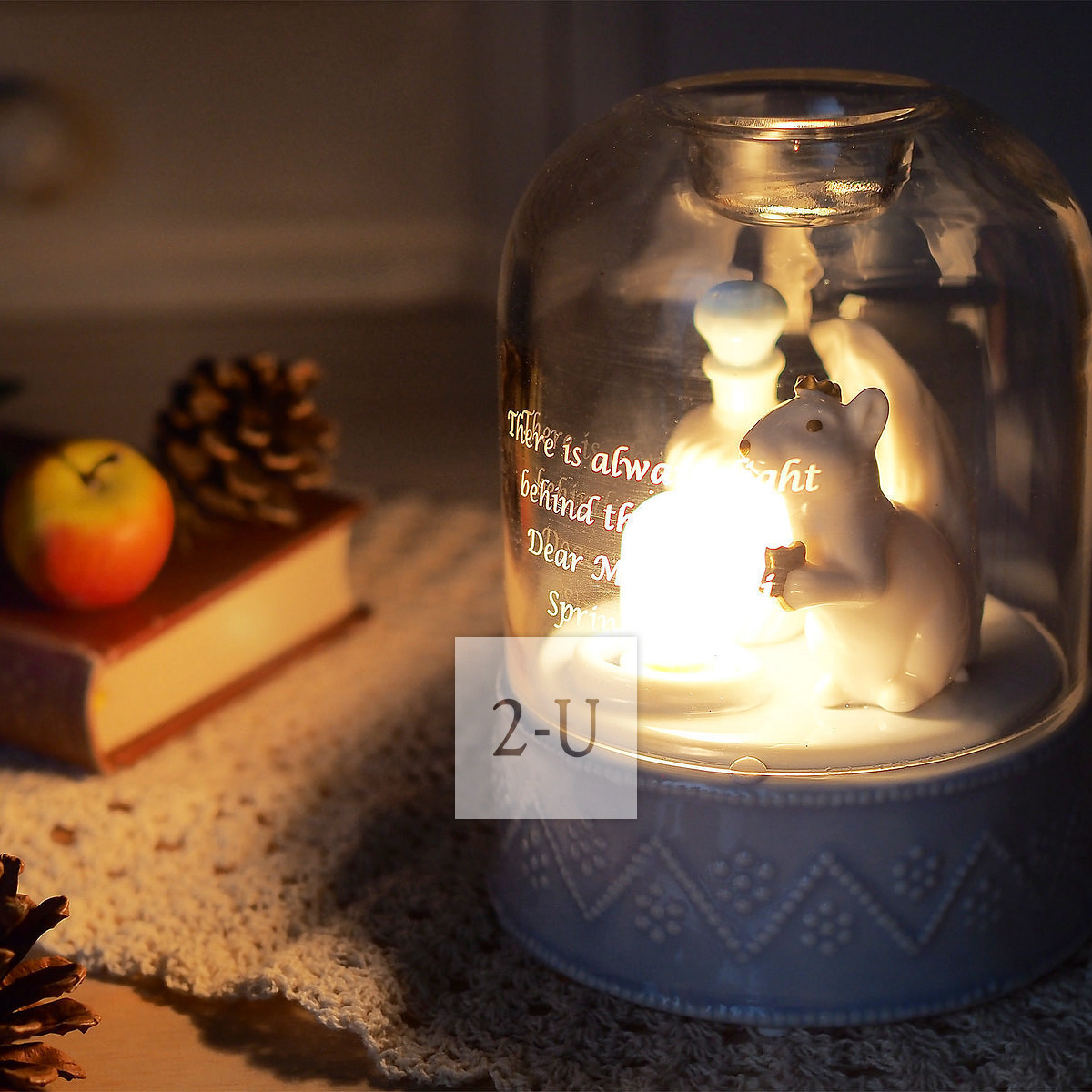 罩子浬罩著小鬆鼠的香薰器,往玻璃罩子頂部的小凹處滴幾滴精油,打開燈的開關,就既可以享受香薰放鬆的愜意暸。