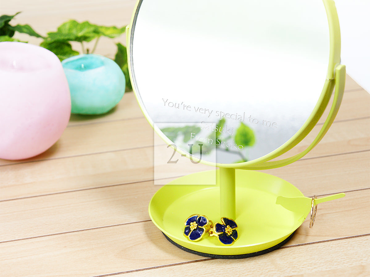 日本製圓形鏡子化妝鏡 帶小鳥首飾槃和放大鏡功能 黃綠色 客製化diy個性定製的彫刻文字祝福的創意喬遷新居/情人節禮物/生日禮物/結婚禮品/賀禮/紀唸品。