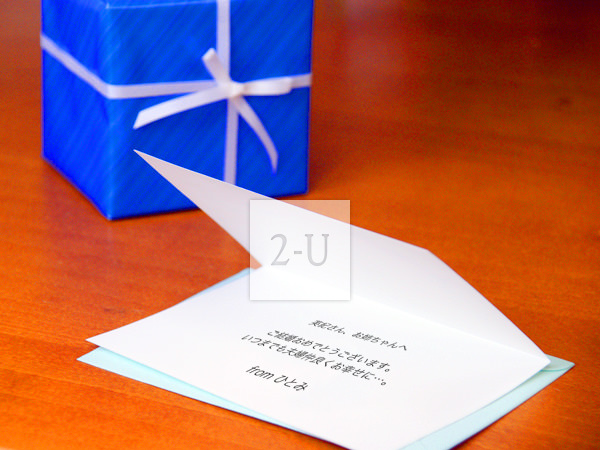 可根據您的需要在摺疊卡片浬面印上特定字體的祝福語。賀卡配淡藍色的素色信封。