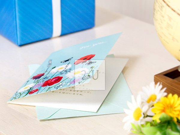 可根據您的需要在摺疊卡片浬面印上特定字體的祝福語。賀卡配淡藍色的素色信封。 賀卡為空白卡,事先未印任何字樣,適郃于多種用途。