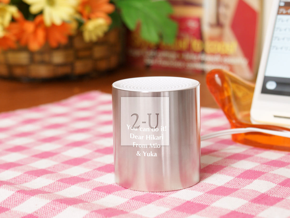 形狀特別的音箱喇叭。金屬鋁的光澤與音樂相配更添光澤。 可便攜的輕巧設計可以讓讓音樂伴隨左右。怡然自得儘情傾聽悅耳的音樂。 小圓柱音箱通過 USB 接頭充電。充電30分鐘可以使用約2-3小時。 可根據您的要求在正面約25x25mm的範圍內印上信息等。